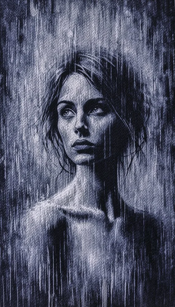 Später habe ich sie im Regen gemalt. Vielleicht, weil sich genau darin etwas von dem wiederfand, was zwischen ihren Sätzen lag: Erschöpfung, Nachhall, Verletzlichkeit und zugleich dieses stille Weitergehen. Der Regen verbirgt nichts, er legt frei.